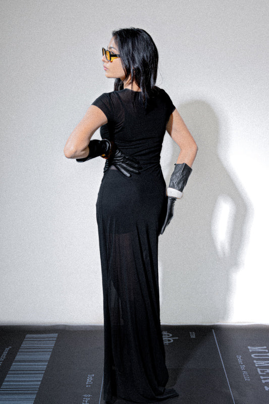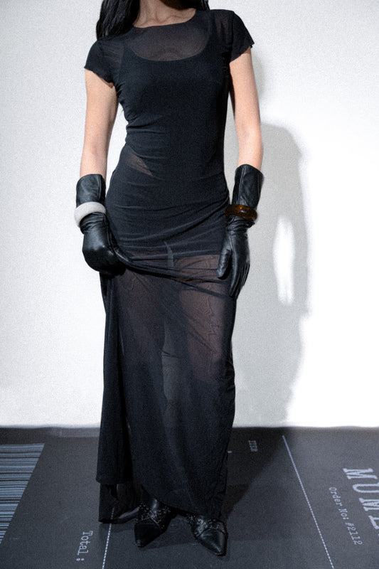 Fits like second skin: sheer dress in mesh net fabric, t-shirt like torso and a tiny trail that whispers both elegance and edgy.